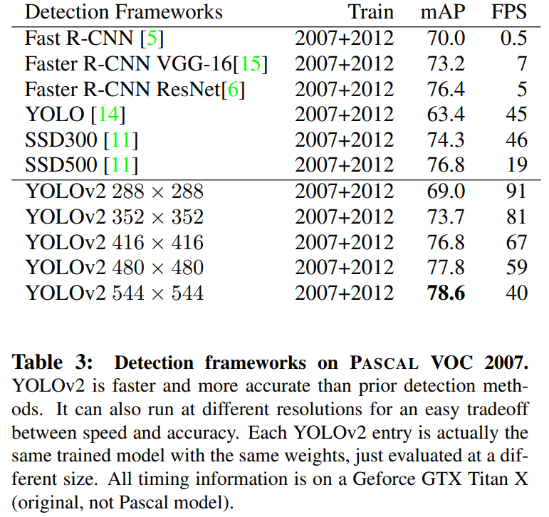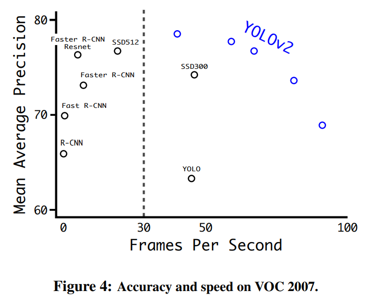 기존 YOLO에 대한 다양한 개선을 제안한 YOLOv2는 속도 및 성능 측면에서 모두 SOTA를 달성한다 (67fps에서 76.8mAP, 40fps에서 78.6mAP).