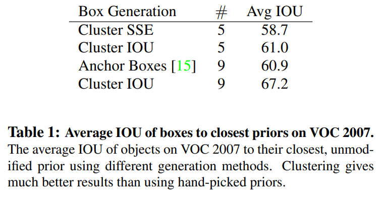 밑의 표를 통해 Cluster IoU를 통해 선택한 5개의 box가 9개의 anchor box와 유사하게 작동하는 것을 확인할 수 있고, 9개의 Cluster IoU box에 대해서는 더 높은 Avg IoU를 확인할 수 있다.
