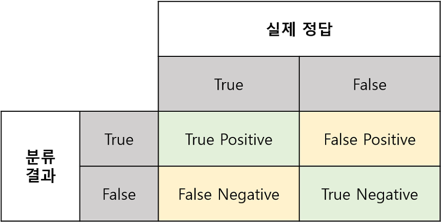 Precision (정밀도) = 모델이 True라고 분류한 것 중에서 실제 True인 것의 비율 = TP/(TP+FP)