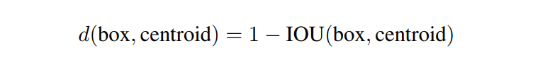 수작업으로 하는 대신 train dataset에서 k-means clustering을 수행하여 최적 box 크기를 정한다. 이때, 측정 기준은 아래 식을 사용한다.
