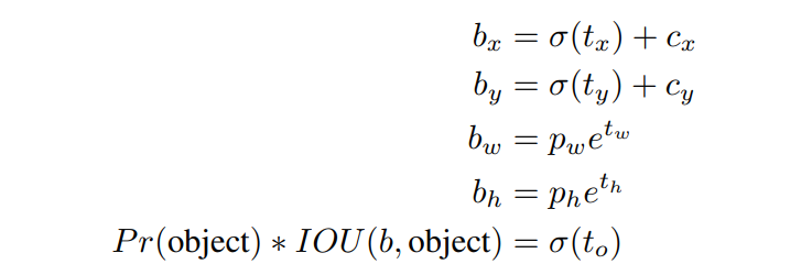 네트워크는 feature map의 각 셀에서 bounding box 5개를 예측한다. 네트워크는 각 경계 상자, tx, ty, tw, th 및 to에 대해 예측한다. 셀이 이미지의 왼쪽 상단 모서리에서 (cx, cy)로 오프셋되고 이전의 경계 상자에 너비와 높이 pw, ph가 있는 경우 예측값은 다음과 같다.