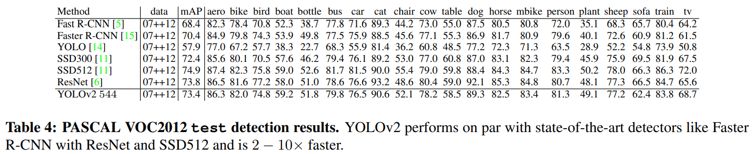 아래 표는 VOC2012 dataset에서의 YOLOv2와 다른 detector의 비교 결과이다. YOLOv2가 훨씬 빠르게 실행되지만 높은 정확도 (73.4mAP)를 달성하는 것을 확인할 수 있다.