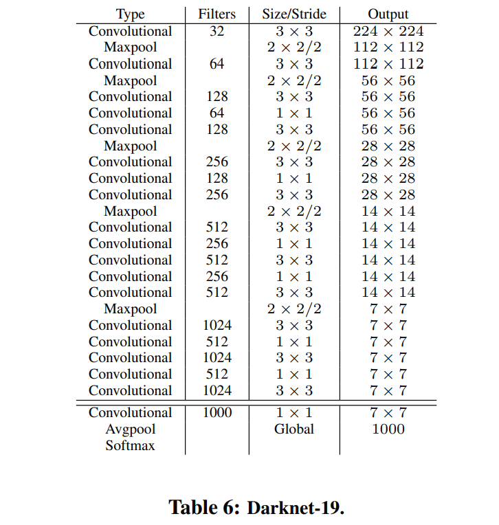 Our final model, called Darknet-19, has 19 convolutional layers and 5 maxpooling layers. For a full description see Table 6. Darknet-19 only requires 5.58 billion operations to process an image yet achieves 72.9% top-1 accuracy and 91.2% top-5 accuracy on ImageNet.Training for classification.