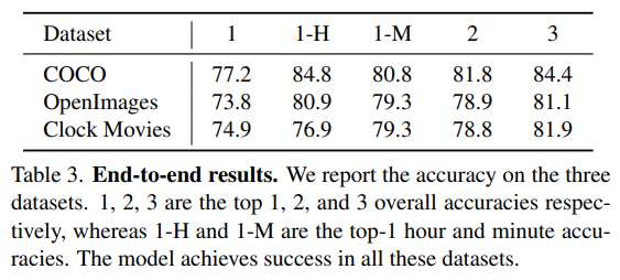 - Minute accuracy: 시간 중 (분)의 정확도 (예측 분율이 +-1 여백 내에서 정확할 때, 우리는 이것이 특히 초침의 부재로 인해, 중간 사건을 해결하는 데 있어 인간의 가독성의 한계에 가깝다고 생각한다.)