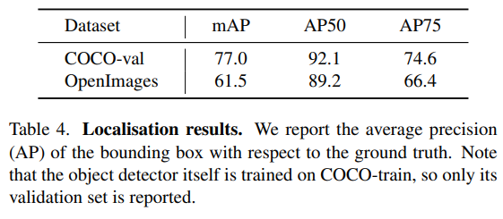 localization과 recognition의 결과를 분리하기 위해 localization의 결과를 먼저 확인한다. 결과는 아래 표와 같다. 결과는 상당히 성공적인 것을 확인할 수 있다.