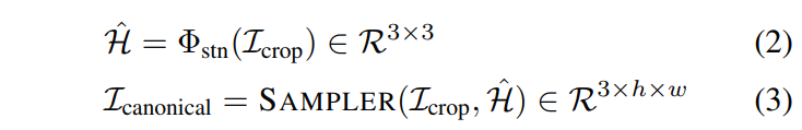 여기서 H_hat ∈ Rˆ3×3은 8개의 자유도에서 예측된 homography 변환을 의미하며, SAMPLER(·)는 I_crop을 표준 이미지I_canonical (시계가 정면에 평행하고 '12' 위치가 맨 위에 있는 이미지)로 변환하는 구별 가능한 warping을 나타낸다.