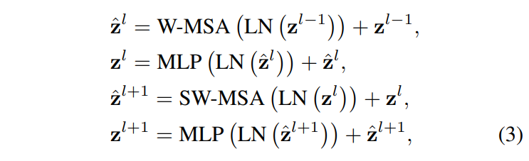 여기서 z^l는 (S)MSA 모듈의 output feature를 나타내고, zl은 block l에 대한 MLP 모듈을 나타낸다. 그리고 W-MSA는 window based multi-head self-attention를 SW-MSA는 shifted window based multi-head self-attention을 나타낸다.