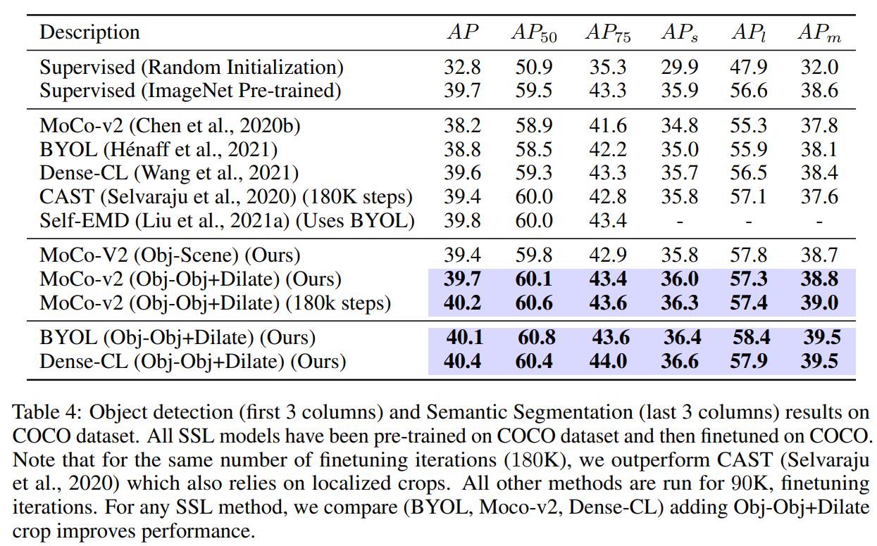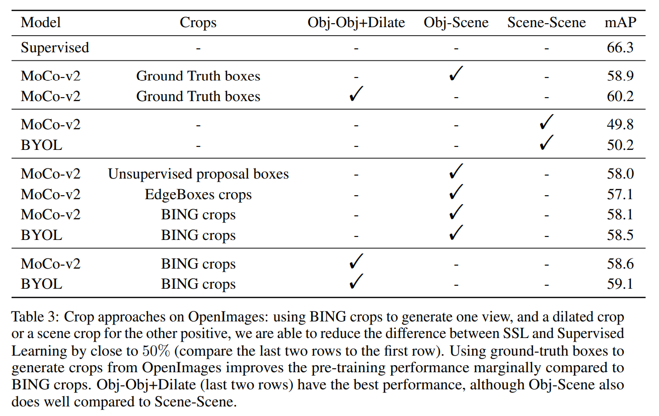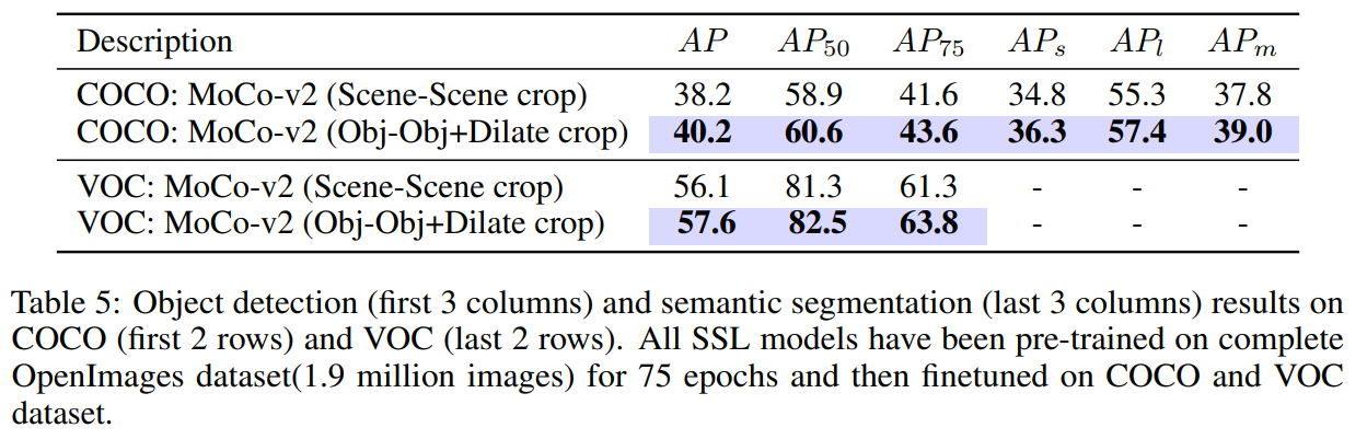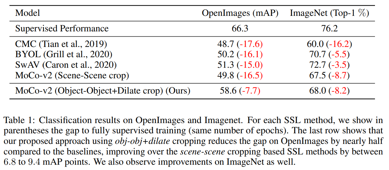 따라서 본 연구에서는, random crop을 object proposal 알고리즘에서 얻은 crop으로 대체하는 것을 제안한다. 이는 모델이 object와 scene 수준의 semantic representation을 모두 학습하도록 한다. Object-aware cropping을 통해 scene를 크게 개선할 수 있다 (OpenImages에서 기존에 비해 8.8 mAP 증가). 또한 SOTA self-supervised learning에 비해 COCO와 PASCAL-VOC의 object detection 및 segmentation task에서 성능을 크게 개선한다.