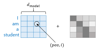 이때, pos는 입력 문장에서의 embedding 벡터의 위치를 나타내며, i는 embedding 벡터 내의 차원의 인덱스를 의미한다 (아래 그림에서는 pos=2, i=3). i가 짝수일때는 sin파, 홀수일때는 cos파를 사용한다.