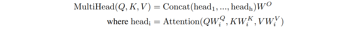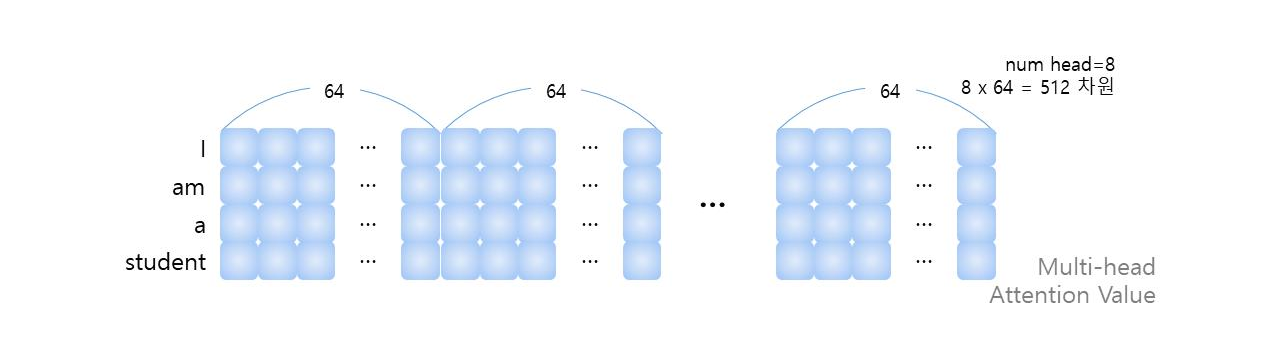 Attention distribution에 대해 V를 곱하여 최종 Attention value를 얻는다. 이러한 Attention value는 앞서 언급했듯이 8개의 multi head로 수행된다. 따라서 다음과 같이 attention value를 합친다.
