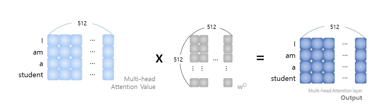 concat된 multi-head attention value에 대해 가중치 W^O를 곱하여 multi-head attention layer의 최종 output을 생성한다. 이 output은 input size와 동일한 (입력 sequence) x 512 차원이 된다.