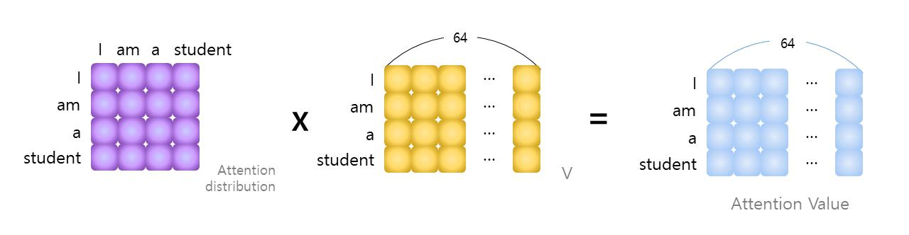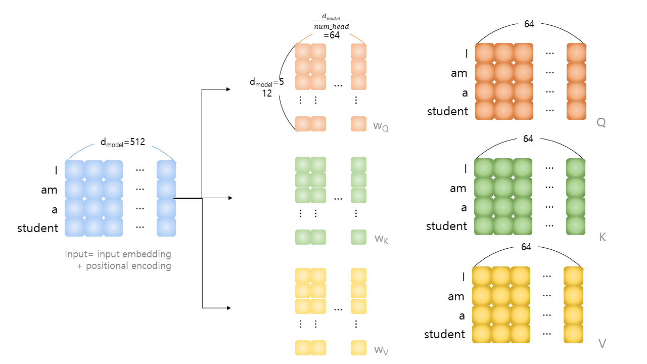 이때 생성하는 Q: query는 영향을 받는 벡터, K: key는 영향을 주는 벡터, V: value는 영향을 주는 정도에 대한 가중치 벡터 이다. Q, K, V의 차원을 64로 한 이유는 병렬 처리를 위한 multi head가512/64=8이기 때문이다.