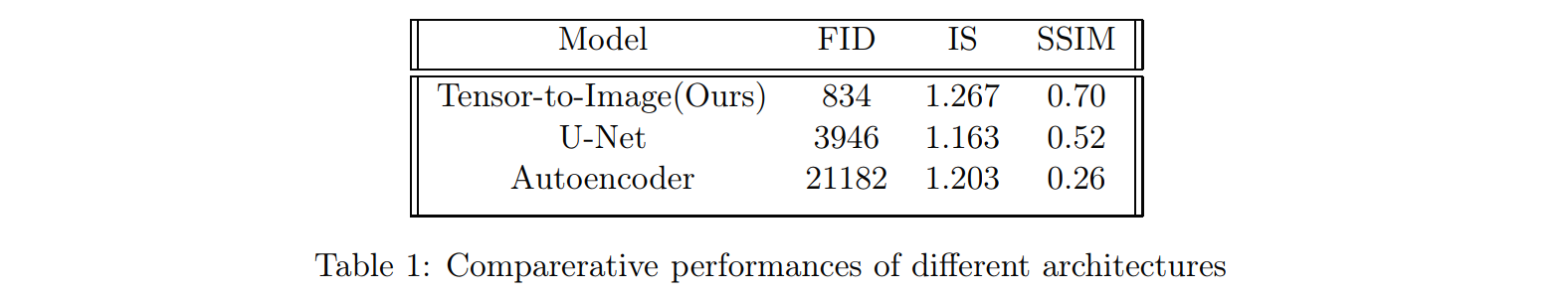 Frechet Inception Distance(FID), Structural Similarity(SSIM), Inceptions Score(IS) 등 이미지 평가 지표를 사용하여 모델을 평가하고 다른 모델과 비교한다. 우리는 대부분의 image-to-image translation 및 image segmentation에 널리 사용되는 U-net과 autoencoder와 비교한다. 다음 표는 모델 별 생성된 이미지의 품질 비교 결과이다.