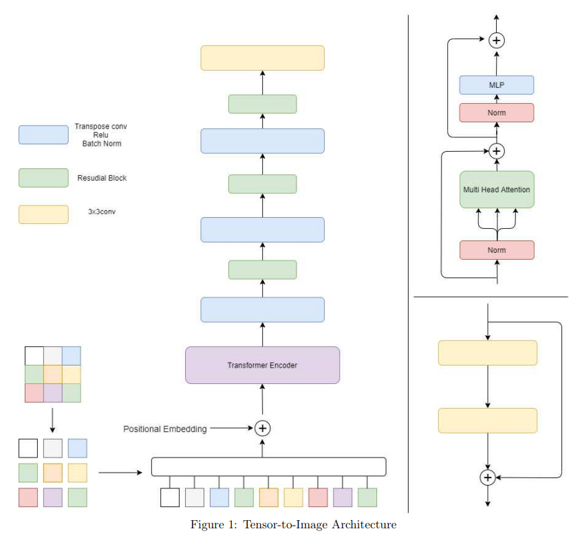 본 논문은 unique한 generator라는 점에서 특별하다. 이전의 다른 방법들과 달리 image understanding을 위해 vision transformer를 사용하고, image generation을 위해 convolutional layer를 사용한다. 일반화 성능을 확인하기 위해 3가지 dataset에 대해 적용하여 autoencoder와 u-net과 같은 방법과 비교를 수행하였다. 코드와 예시는 https://github.com/YigitGunduc/tensor-to-image에서 확인할 수 있다.