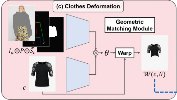 이 단계에서는 target item c를 S^의 의류 영역인 Sc^와 일치하도록 변형한다. 우리는 CPVTON에서 제안한 geometric matching module을 clothing-agnostic person representation (Ia, P)와 Sc^ 를 입력으로 사용한다. 먼저 (Ia, P)와 c에서 추출한 형상 사이의 상관 행렬이 계산된다. 상관 행렬을 입력으로 하여, 회귀 네트워크는 TPS 변환 parameter θ ∈ R^(2×5×5)를 예측하고, c는 θ에 의해 warped된다. 학습 단계에서 모델은 Sc^ 대신 S에서 추출한 Sc (segmentation map S에서 c의 영역)를 취한다. 모듈은 warped item과 I에서 추출한 옷 Ic(실제 이미지 I에서의 c영역) 사이의 L1 loss로 학습됩니다. 또한 warped 의류 이미지의 obvious distortions을 줄이기 위해 second-order difference constraint를 채택한다. 옷을 몸에 맞게 휘어지게 하는 overall objective function은 다음과 같다.
