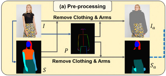 먼저 pretrained network를 통해 I의 segmentation map S ∈ L^(H×W)와 pose map P ∈ R^(3 × H×W)를 예측한다 (L은 의미 레이블을 나타내는 정수 집합이다 =segmentation 했다는 말). S는 교체할 의류 영역을 제거하고 이미지의 나머지 부분을 보존하는 데 사용된다. P는 손이 아닌 팔은 재생산이 어렵기 때문에, 팔을 제거하는 데 활용 된다. S와 P를 기반으로 모델이 원래 의류 정보를 완전히 제거하고 나머지 이미지를 보존할 수 있는 Ia와 Sa를 생성한다. 또한 생성 품질을 향상시키는 골격 구조를 나타내는 RGB 포즈맵 P에 Ia 또는 Sa를 연결한다.