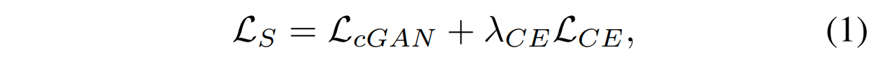 Lce와 Lcgan은 각각 S^과 S 사이의 pixel-wise cross-entropy loss와 conditional adversarial loss을 나타낸다. λce는 hyperparameter이다.