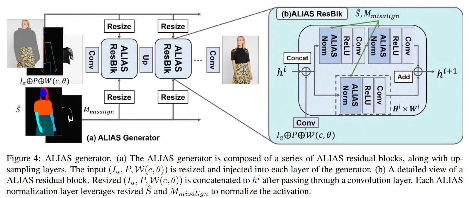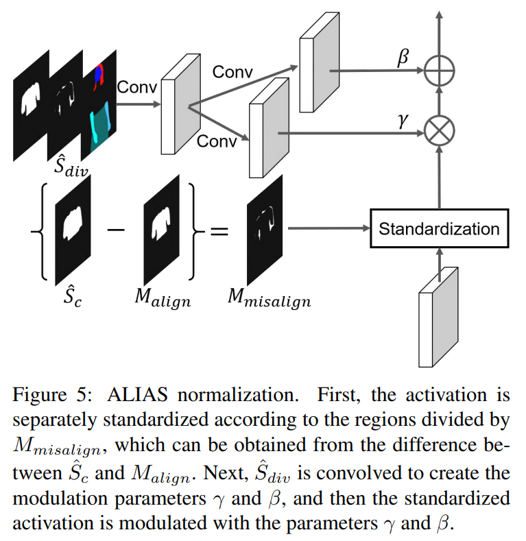 이전 단계의 output을 기반으로 최종 합성 이미지 I^를 생성하는 것을 목표로 한다. 전체적으로 우리는 (Ia, P)와 W(c, θ)를 융합한다. (Ia, P, W(c, θ))는 generator의 각 layer에 input된다. S^의 경우, ALIgnment-Aware Segment (ALIAS) normalization이라는 새로운 conditional normalization 방법을 제안한다. ALIAS normalization은 S^와 해당 영역의 mask를 활용하여 semantic 정보를 보존하고 misaligned 영역에서의 misleading information를 제거한다.