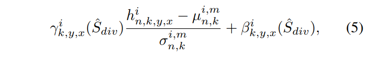 먼저 Eq. (3)과 Eq. (4)로부터 Malign과 Msalign을 얻는다. S^의 수정된 버전을 Sdiv^로 정의한다 (S^의 Sc^는 Malign과 Mimsalign으로 분리). ALIAS normalization은 Mmisalign 영역과 hi의 다른 영역을 별도로 표준화 한 다음 Sdiv^에서 추론한 affine 변환 파라미터를 사용하여 표준화된 activation를 modulate한다. e activation value at site (n ∈ N, k ∈ C i , y ∈ Hi , x ∈ Wi )는 다음과 같이 계산한다.