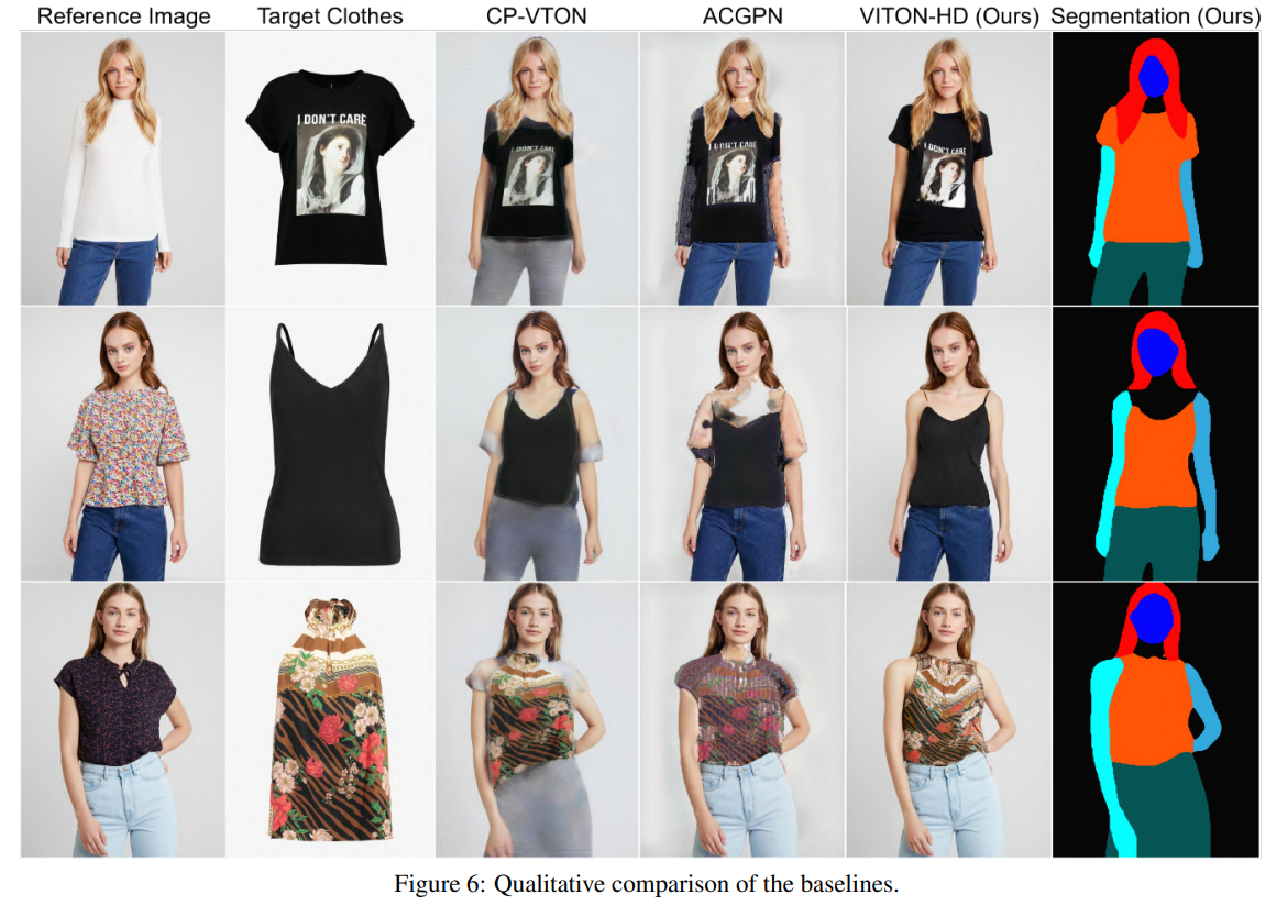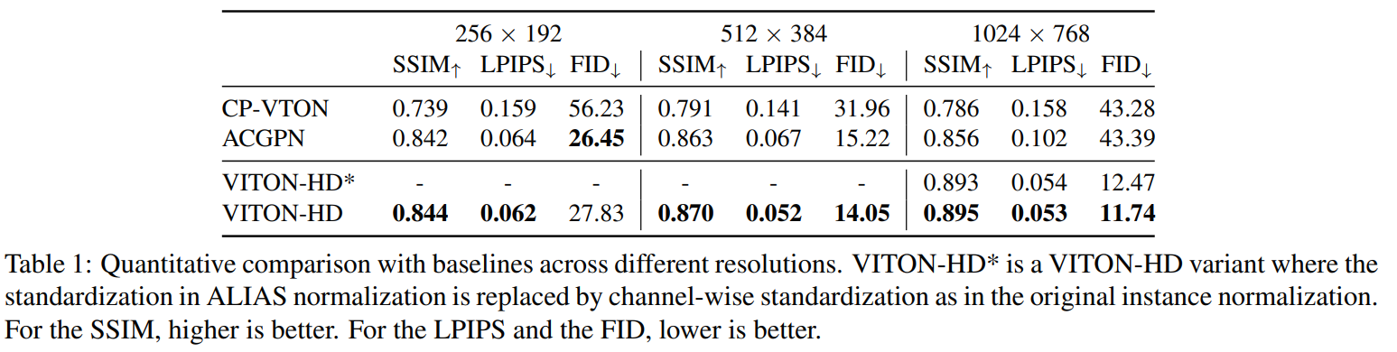 1024 x 768 해상도의 사실적인 virtual try-on image를 합성하는 VITON-HD를 제안한다. 제안된 ALIAS normalization는 misaligned 영역을 적절히 처리하고 semantic information를 ALIAS generator 전체에 전달할 수 있으며, multi-scale refinement를 통해 의류의 세부 사항(EX. 질감)을 보존한다. 정성적 및 정량적 실험은 VITON-HD가 큰 차이로 기존의 방법들을 능가한다는 것을 입증한다.