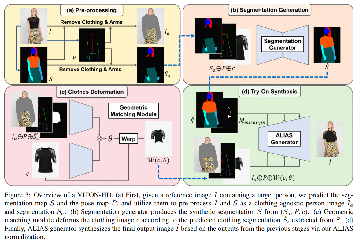 위의 그림은 VITON-HD의 아키텍처이다. 사람 이미지 I ∈ R^(3×H×W)와 의류 아이템 c ∈ R^(3×H×W)가 주어졌을 때, VITON-HD의 목표는 주어진 사람이 해당 의류 아이템을 입은 합성 이미지 I^을 생성하는 것이다.