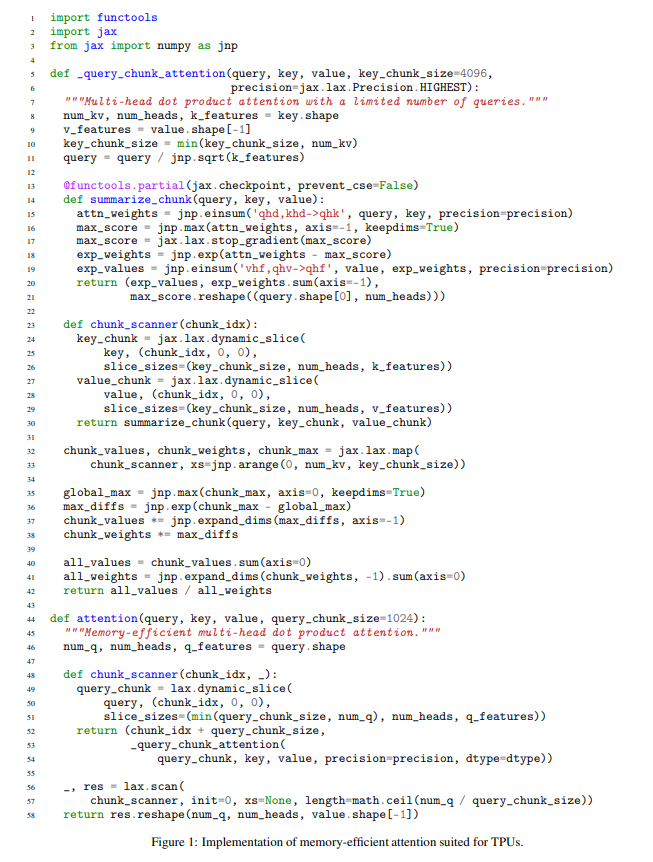 본 연구에서는 각각 상수 메모리가 필요한 attention과 로그 메모리만 필요한 self-attention을 제안한다. 기본 알고리즘은 매우 간단하지만 수치적으로 실현 가능하려면 트릭이 필요하다. 또한 TPU에서 효율적으로 실행되며 self-attention을 위해 O(√ n) 메모리가 필요한 JAX을 구현한다.