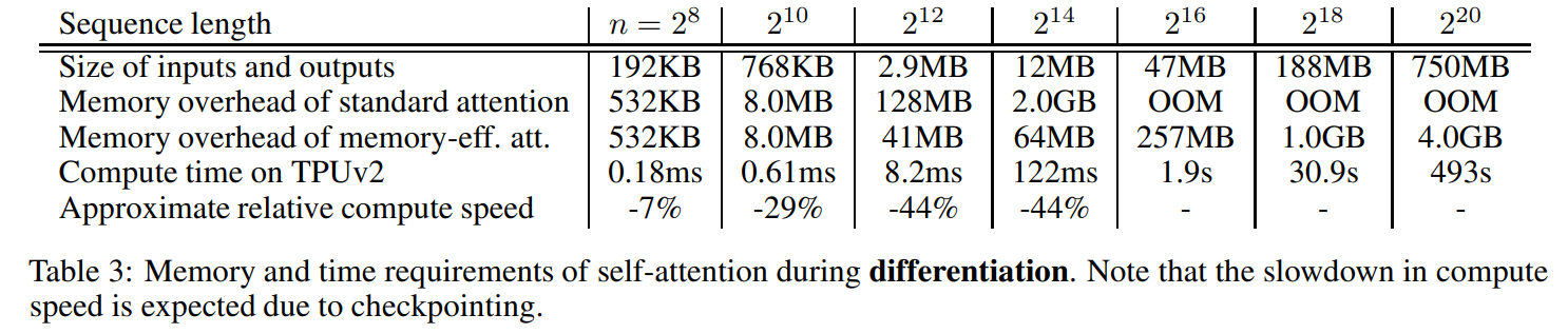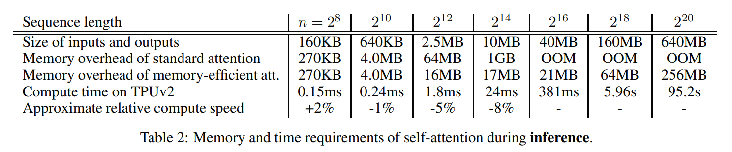 Sequence 길이와 관련하여 O(1) 메모리가 필요한 attention 알고리즘과 O(log n) 메모리가 필요한 self-attention 알고리즘을 제안한다. 기존 self-attnetion은 O(n^2) 메모리를 필요로 한다. 본 논문에서 제안하는 알고리즘도 시간 복잡도는 여전히 O(n^2)이지만 현재 가장 큰 문제인 메모리 문제를 완화한다. 따라서 attention의 메모리 요구 사항을 줄이면 더욱 긴 시퀀스를 처리할 수 있다. 또한 메모리 효율성을 유지하면서 기능을 차별화하는 방법을 시연한다. 시퀀스 길이가 16384의 경우, self attention의 메모리 overhead는 추론에서 59배, differentiation에서는 32배 감소한다.