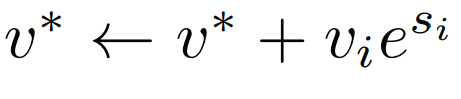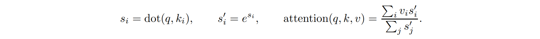 이는 상수 메모리로 계산할 수 있다.: 이 알고리즘의 메모리 overhead는 벡터 v와 스칼라 s로 구성되며, 둘 다 0으로 초기화된다. Query q, key k, value v가 주어지면 key와 value를 순서대로 처리한다. key와 value 쌍 ki, vi가 주어지면 si = dot(q, ki)를 계산하고 v* ← v* + + vi e^si와 s* ← s* + + e si를 업데이트한다. 모든 key와 value를 처리한 후 v*/s*를 분할하여 최종 결과를 얻는다.