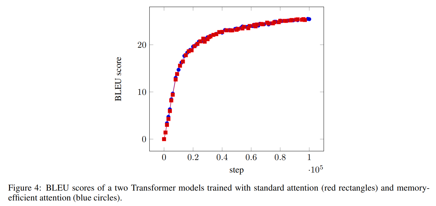 Transformer 아키텍처에 표준 attention 모듈과 메모리 효율적인 attention 모듈을 사용하여 WMT en-de 변환 실험을 실행했다. 학습 내내, 두 방법은 거의 동일하게 행동했다. 10만 번의 학습 단계를 거친 후, 평가 정확도는 메모리 효율적인 구현의 경우 62.69에 달했고 표준 구현의 경우 62.59에 도달했다. 이는 메모리 효율적인 자기 주의 구현이 기존 구현을 대체하는 데 사용될 수 있음을 보여준다. 아래 그림은 두 모델이 매우 유사한 BLEU 점수를 얻었음을 보여준다.