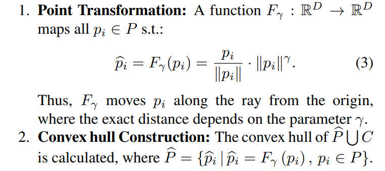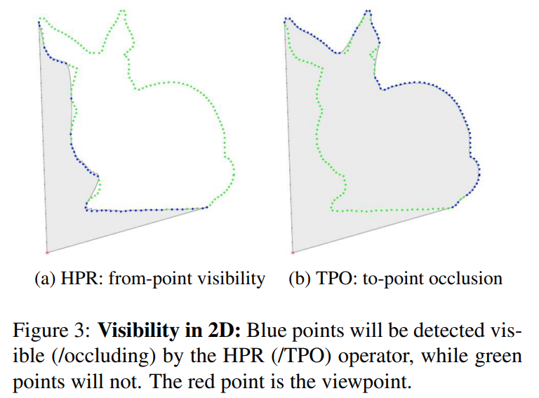 Hidden Point Removal(HPR) 연산자는 표면 reconstruction을 제외하고 P의 visible point의 하위 세트를 직접 결정한다. 연산자는 두 단계로 구성된다 (C가 원점에 있다고 가정).