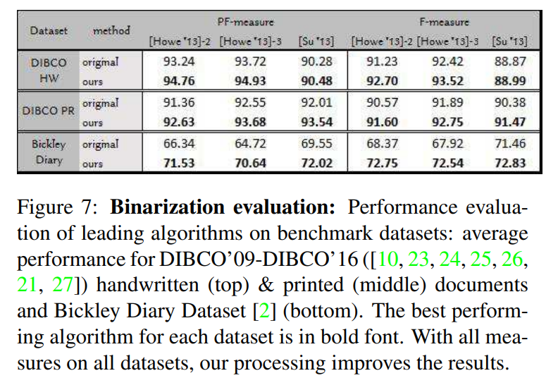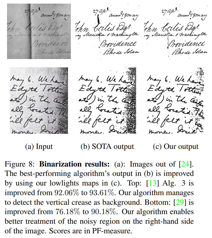 우리는 이 아이디어의 이점을 위의 그림에 설명된 것처럼 두 가지 작업에서 입증한다.- Text image binarization: 왜곡되거나 성능이 저하된 문서에서 텍스트를 추출하고 이진 이미지를 만든다.
