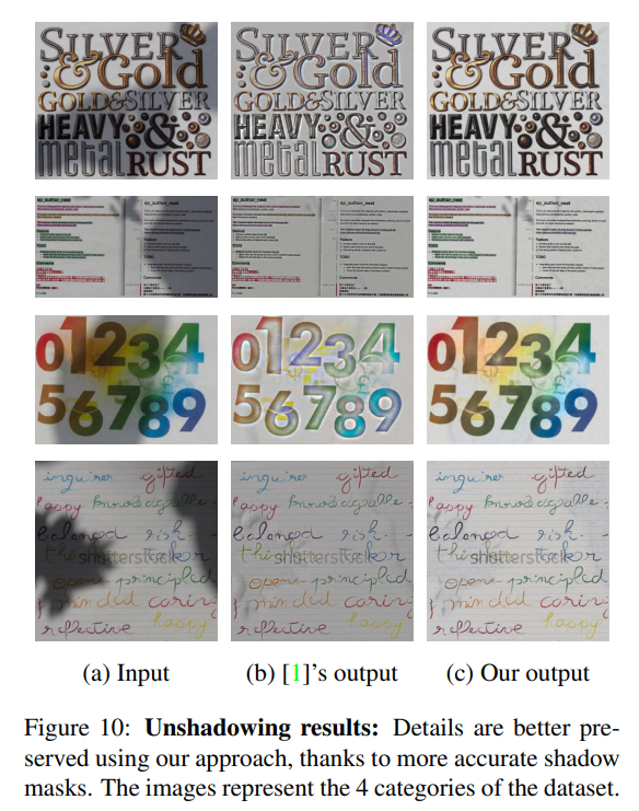 수기 문서, 인쇄 문서, 포스터, 글꼴의 네 가지 범주에서 381개의 인공 그림자 이미지의 새롭고 다양한 벤치마크에서 알고리즘 평가를 수행한다. 각 범주는 7-10개의 문서로 구성되며 각 문서는 그림자 강도, 모양 및 위치의 8-12가지 변형이 존재한다. 여기에는 11개의 문서에서 생성된 81개의 이미지가 포함된 데이터 세트가 포함되어 있으며, 모두 글꼴이 작고 색 변화가 거의 없으며 그림자가 완만하다(즉, 입력이 실제와 유사함).