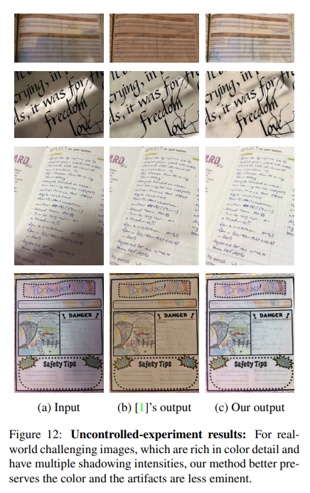 --> 배경이 어둡거나, 노이즈 (그림자, 이물질 등)가 밝거나, 글자(전경)이 밝은 색인 경우 해결X --> 이미지의 색상을 이용하는 것은 너무 문서 이미지에만 국한되어버린다고 생각함 (반대로 문서 이미지에 특화된 그림자 제거라고 생각할 수도 있긴 하지만,,)