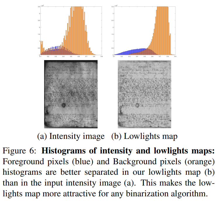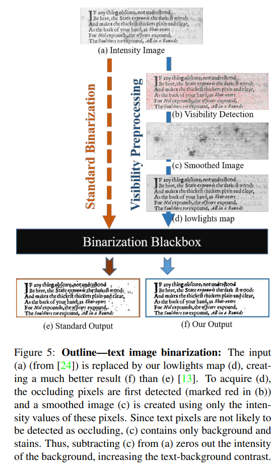 Why does visibility information assist us? 위의 그림(a)을 살펴보면, 우리가 제안하는 표현은 흰색 배경에 어두운 텍스트 픽셀을 깊은 계곡의 지점에 할당할 것이다. 일정하고 강도가 높은 배경은 높은 고원으로 바뀝니다 (3D에서 텍스트는 밑으로, 배경은 위로). 뚜렷한 강도 특성이 없는 텍스트의 얼룩은 무구조로 표현돼 '화산' 지형을 닮게 된다. 어두운 지역인 배경에 얼룩이 생기면 높은 고원의 분화구나 얕은 계곡이 생긴다. visibility detection operators는 텍스트와 나머지로 구분하는데 성공한다.