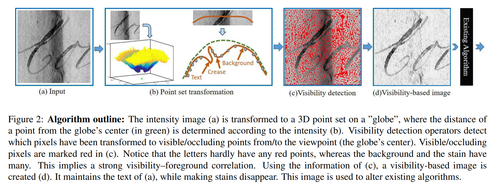 본 논문은 다양한 유형의 문서를 처리하기 위한 general한 접근법을 제안한다. 고유성 (Uniqueness), 다양한 강도 (varying intensity), 상대성(relativity)과 같은 픽셀의 특성을 측정하는 대신, 3D point의 visibility 혹은 occlusion을 결정한다. 우리는 간단하고 효율적인 O(nlogn) 연산을 통해 다른 방법으로 숨겨진 이미지의 속성을 드러낸다는 것을 보여준다.