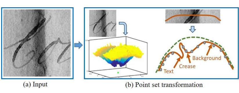 아래 그림과 같이 손상된 이미지가 주어지면, 우리의 목표는 배경과 텍스트를 구분하여 새로운 이미지를 생성하는 것이다. 생성된 이미지는 문서를 처리하는 모든 알고리즘에 있어서 도움이 된다. 본 방법론의 핵심 아이디어는 이미지를 3D point로 변환하는 것이다. Visible과 invisible로 point를 분류하는 것은 배경과 전경 픽셀을 구분하는 것이다. 알고리즘은 총 4단계이다.