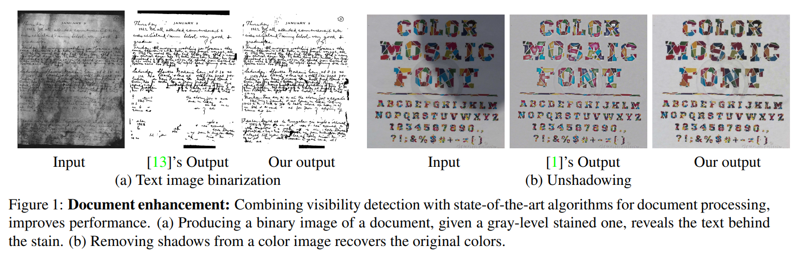 What does it mean for a point to be visible? 이 질문은 CV에서 널리 연구되어 왔지만, 항상 point가 실제 장면의 샘플링이라고 가정되어 왔다. 우리는 본 연구에서 이 질문에 대한 답이 이미지에 대한 독특하고 유용한 정보를 드러낸다는 것을 보여준다. 우리는 문서 이진화와 그림자 제거에 대한 이 아이디어의 이점을 보여준다.