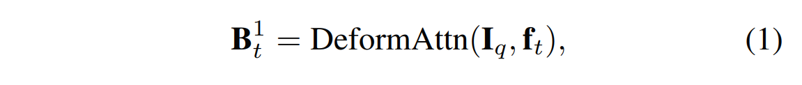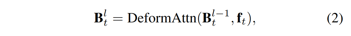 Bt^1 ∈ R^(C)는 첫 번째 decoder layer의 t 프레임에 대한 box query이다. DeformAttn은 deformable attention module을 의미한다. Query 요소와 frame feature map ft가 주어지면 deformable attention은 작은 key sampling points set에만 적용된다. l-th(l>1) layer에서 box query Bt^(l−1)sms input으로 주어진다.