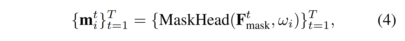 Nd decoder layer 후에 instance query와 각 instance에 대한 T box query를 얻는다. Instance query는 공유 비디오 수준 instance 표현이며 box query는 각 프레임의 bounding box를 예측하기 위한 위치 정보를 포함한다. N instance query는 output instance embedding 및 T box embedding {BEt}, BEt ∈ R^(N×d)로 변환된다.