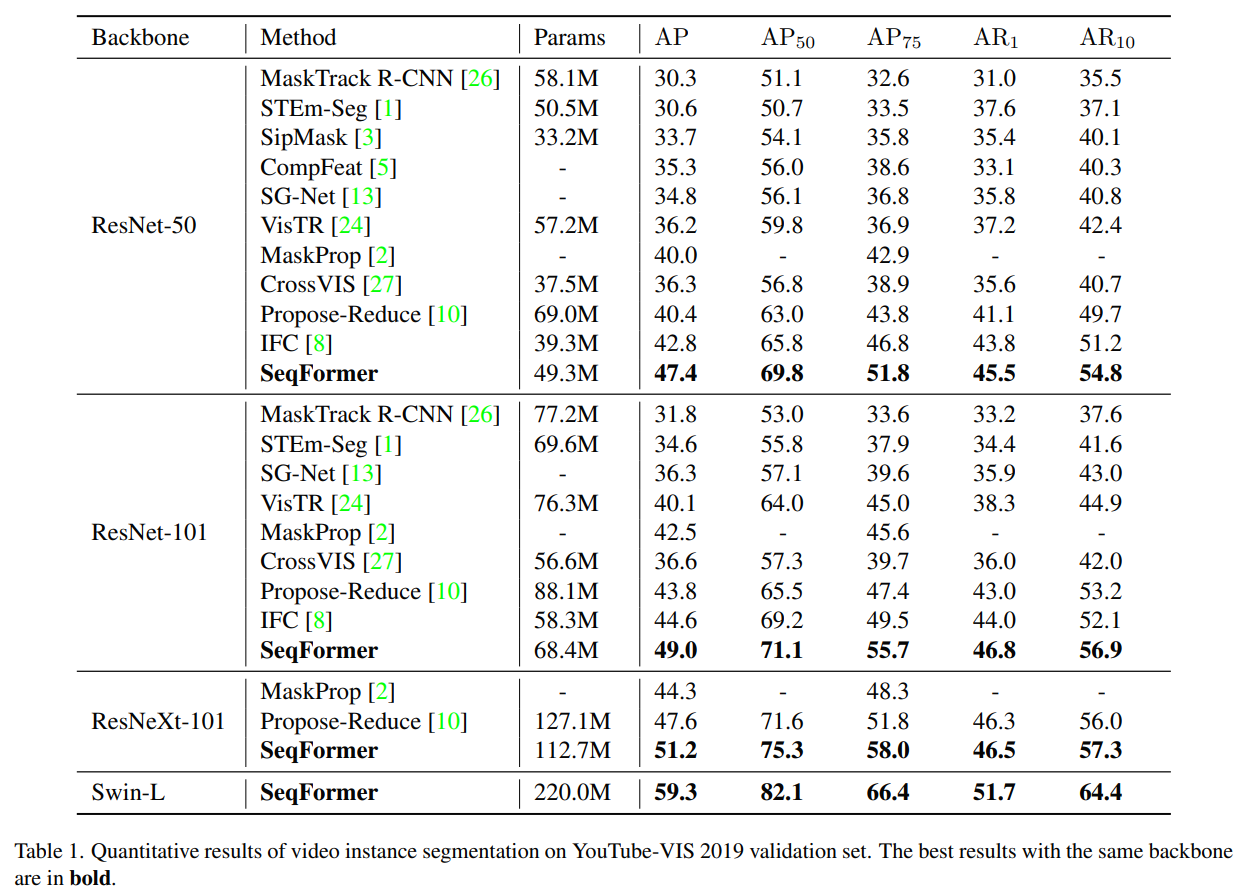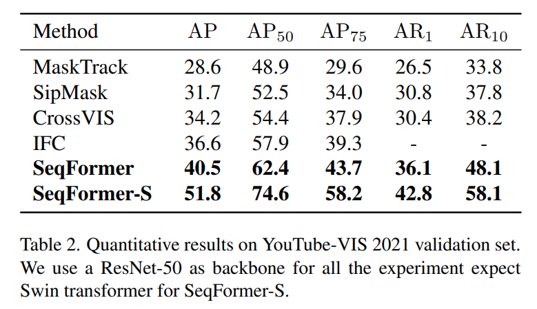 SeqFormer가 SOTA를 능가하는 것을 확인할 수 있다.