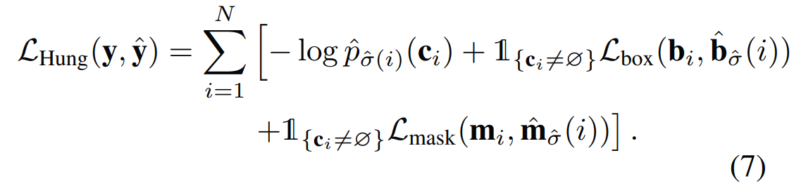 앞서 구한 yˆ 순열 조합인 σˆ에 따라 최종 손실함수 L_Hung를 계산한다 (L_mask는 Dice loss와 Focal loss의 결합).