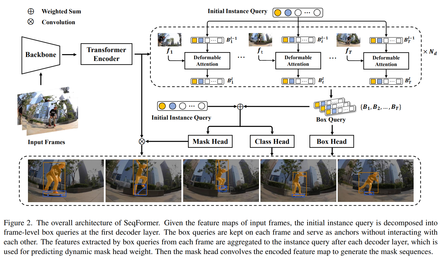 본 논문에서는 각 프레임에서 독립적으로 attention 메커니즘을 수행하고 각 비디오 레벨 instance에 대해 공유된 강력한 instance query를 학습하는 SeqFormer라는 비디오 instance segmentation을 위한 transformer 아키텍처를 제안했다.