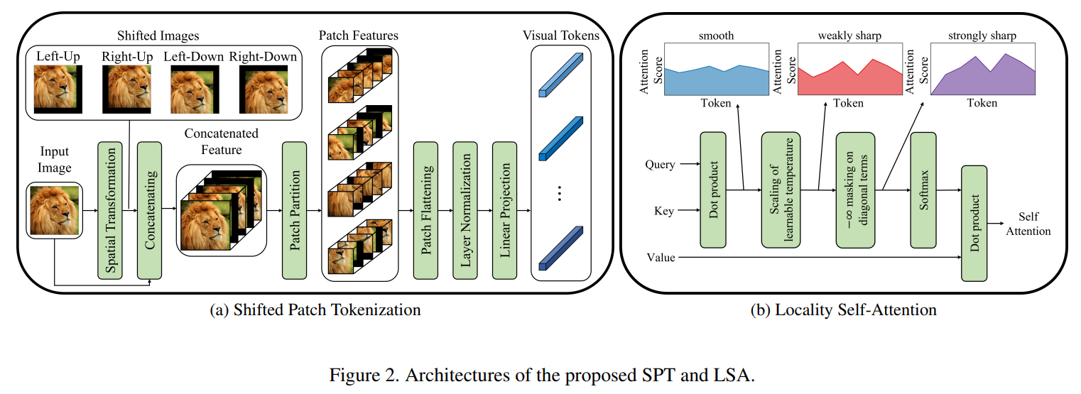 이를 해결하기 위해 본 논문에서는 SPT(Shifted Patch Tokenization)과 LSA(Localy Self-Attention) 제안