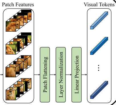 4. Patch flattening, layer normalization, linear projection 수행 (Visual Tokens)