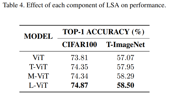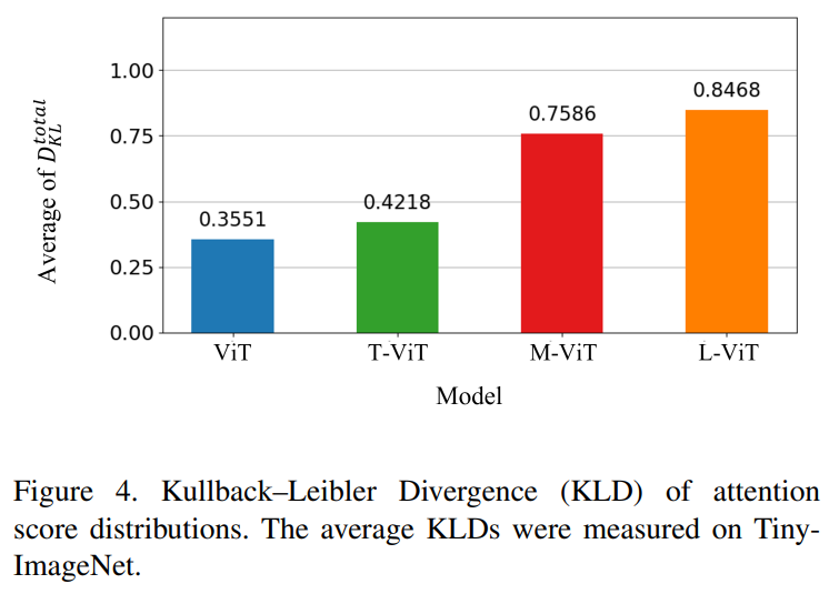 • L-ViT가 ViT보다 약 0.5 크기때문에 LSA가 attention score 분포의 평활화 문제를 완화한다는 것을 알 수 있음 (KLD 의 평균이 낮을수록 attention score 분포가 평평하다는 의미)
