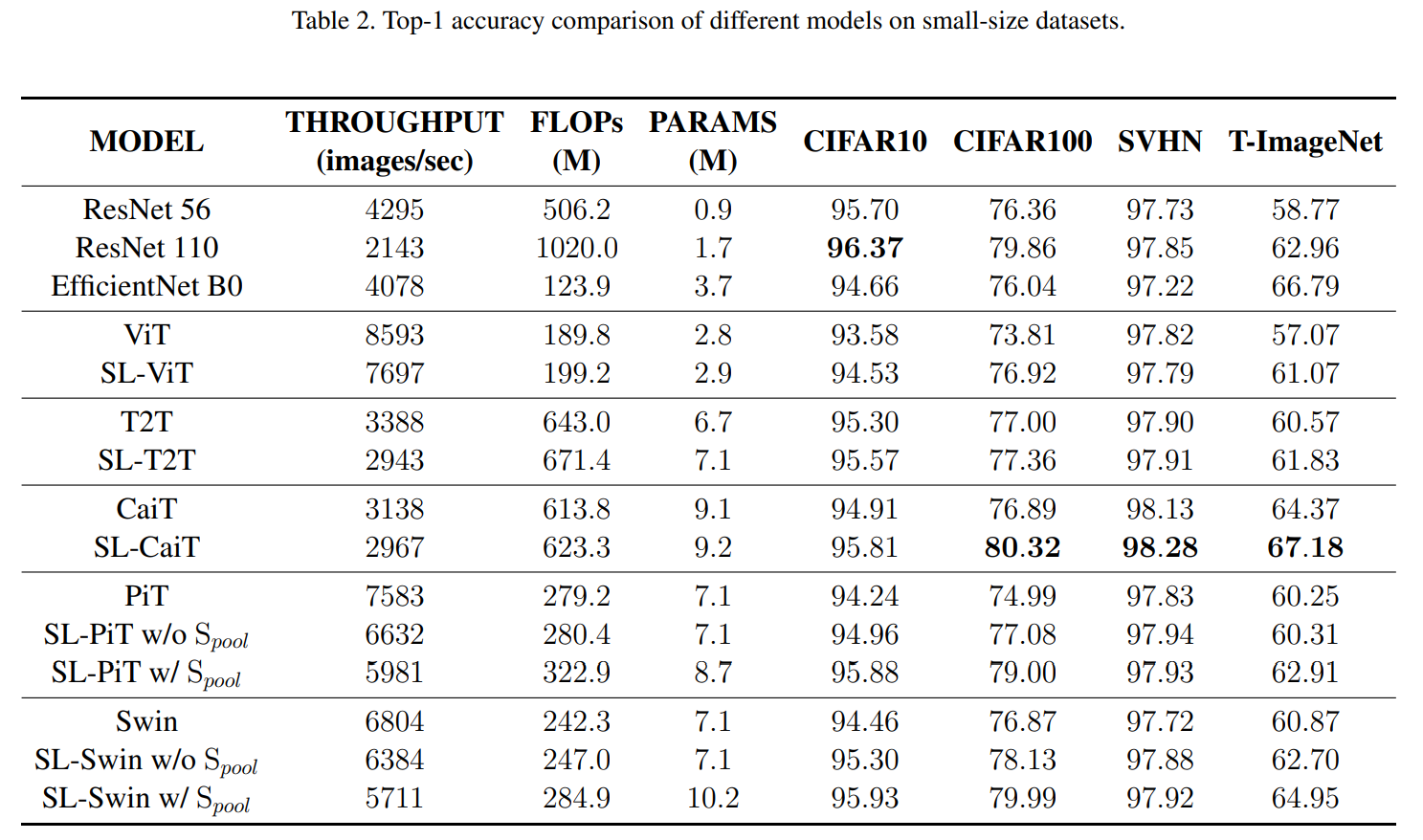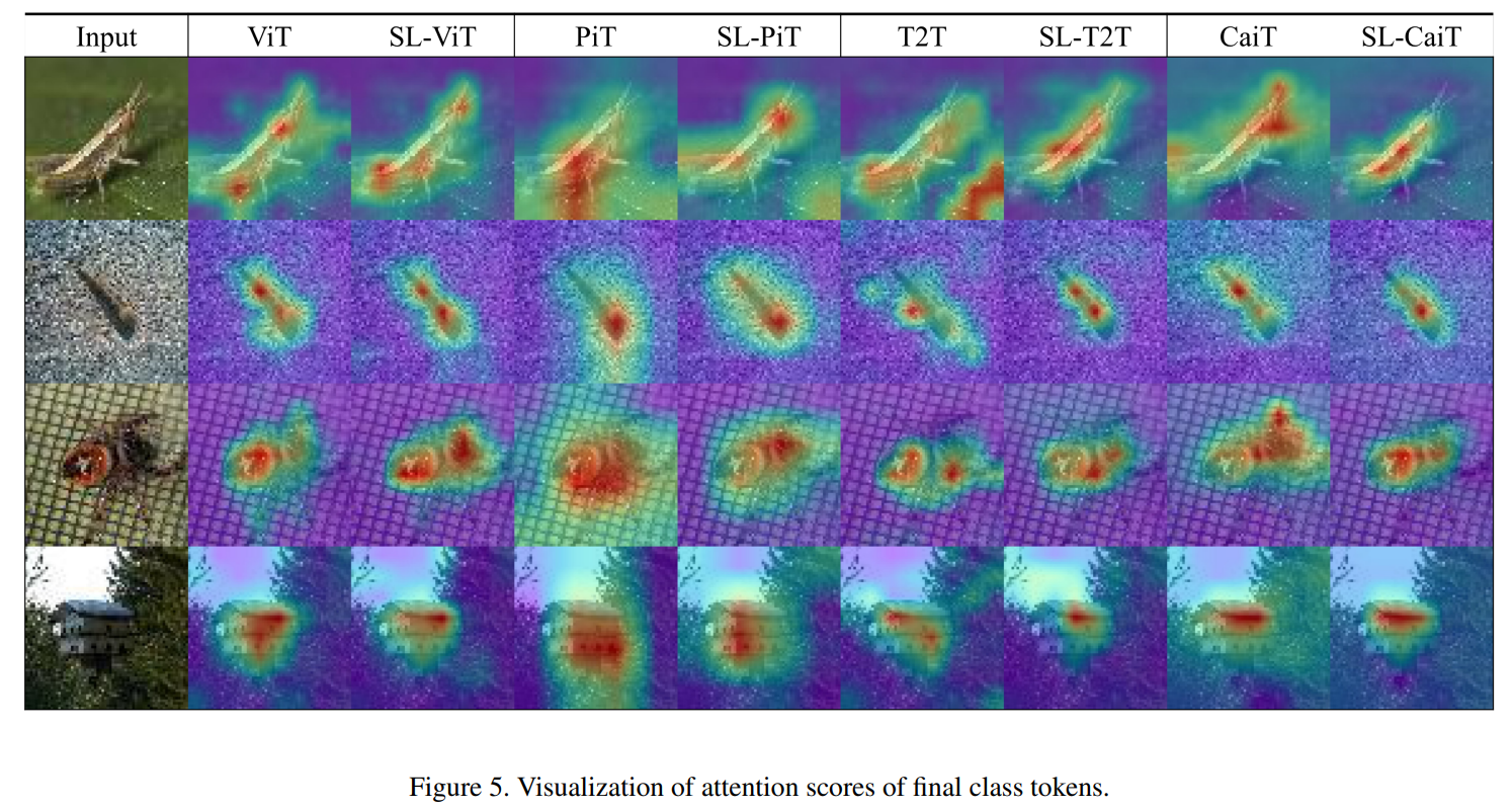 • SPT와 LSA를 ViT에 적용했을 때, 최종 class token의 attention score 시각화 결과 (모델명 앞에 SL이 붙은 것이 SPT와 LSA를 적용한 것)