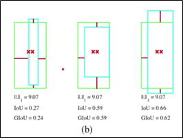 위의 그림 (a)에서 볼 수 있듯이 두 박스의 왼쪽 하단 거리와 오른쪽 상단 거리가 동일할 때, MSE (=L2 loss)는 일정하지만 box의 겹침 정도를 나타내는 IoU는 값이 변한다. 동일하게 그림 (b)에서도 중심 사이의 거리와 높이, 너비 차이가 동일할 때, L1 loss는 일정하지만, IoU는 값이 변한다.