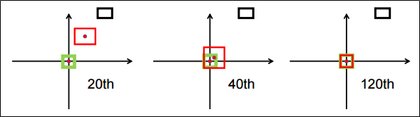 DIoU Loss를 활용한 Bbox 예측 과정 Iteration에 따른 DIoU Loss의 bounding box 예측 과정(초록: GT, 빨강: Bbox)을 보면 GT와의 overlap을 위해 Bbox 영역을 넓히는 GIoU와는 달리 DIoU는 중심 좌표를 비교하여 Bbox 자체가 GT 쪽으로 이동하는 것을 확인할 수 있다.