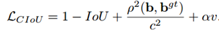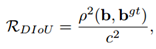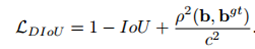 L(DIoU)는 기존 IoU Loss에 중심 좌표를 고려하는 수식을 추가한 수식으로, ρ는 Euclidean distance, b는 Bbox, b^gt는 GT의 중심 좌표, c는 Bbox와 GT를 포함하는 최소 박스인 C 박스의 대각 길이를 의미한다.
