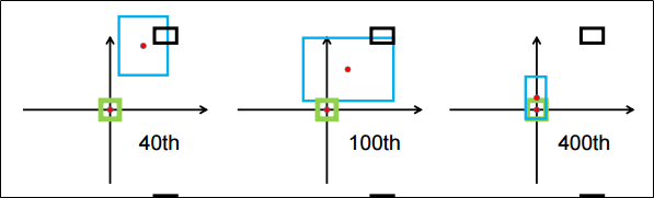 Iteration에 따른 GIoU Loss의 bounding box 예측 과정(초록: GT, 파랑: Bbox)을 보면 GT와의 overlap을 위해 Bbox 영역이 넓어지고, overlap 된 후 IoU를 높이기 위해 Bbox 영역 줄이는 방식으로 수행된다.